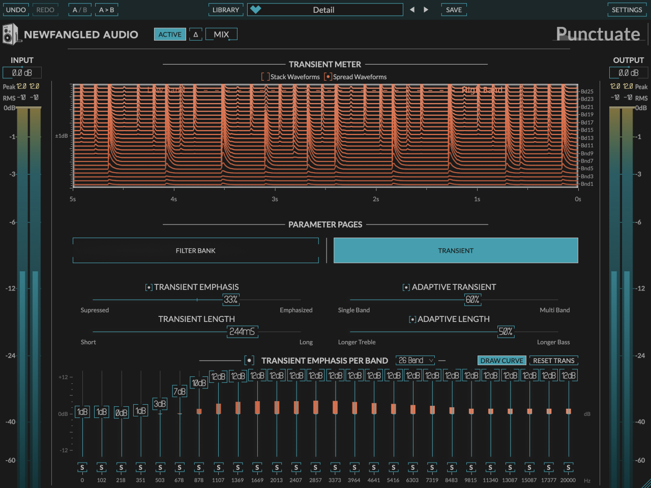 Punctuate uses these filters to break the incoming audio signal into the 26 critical bands, and runs a transient shaper on each band for unprecedented control over the transients of the audio signal. By doing this, Punctuate allows you to add punch in only the places where the signal needs, instead of just slamming the level of the entire signal up and down at the transient point. Because you have independent control over the bands, you can even emphasize transients in some bands while suppressing them in others. And because it’s based on Critical Bands, it does this in such a way that sounds natural to the human ear, so you don’t hear any artifacts. Finally, Punctuate allows you to smooth the transient modulation across bands using the ADAPTIVE TRANSIENT control. This allows you to run the bands independently for ultimate control, or couple them for a smoother sound.