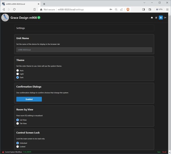 The settings panel allows users to enter a browser tab name for the m908, select dark or light theme, activate confirmation dialogs, select list or tile view for the room EQ, and enable a lockout for the home screen controls.