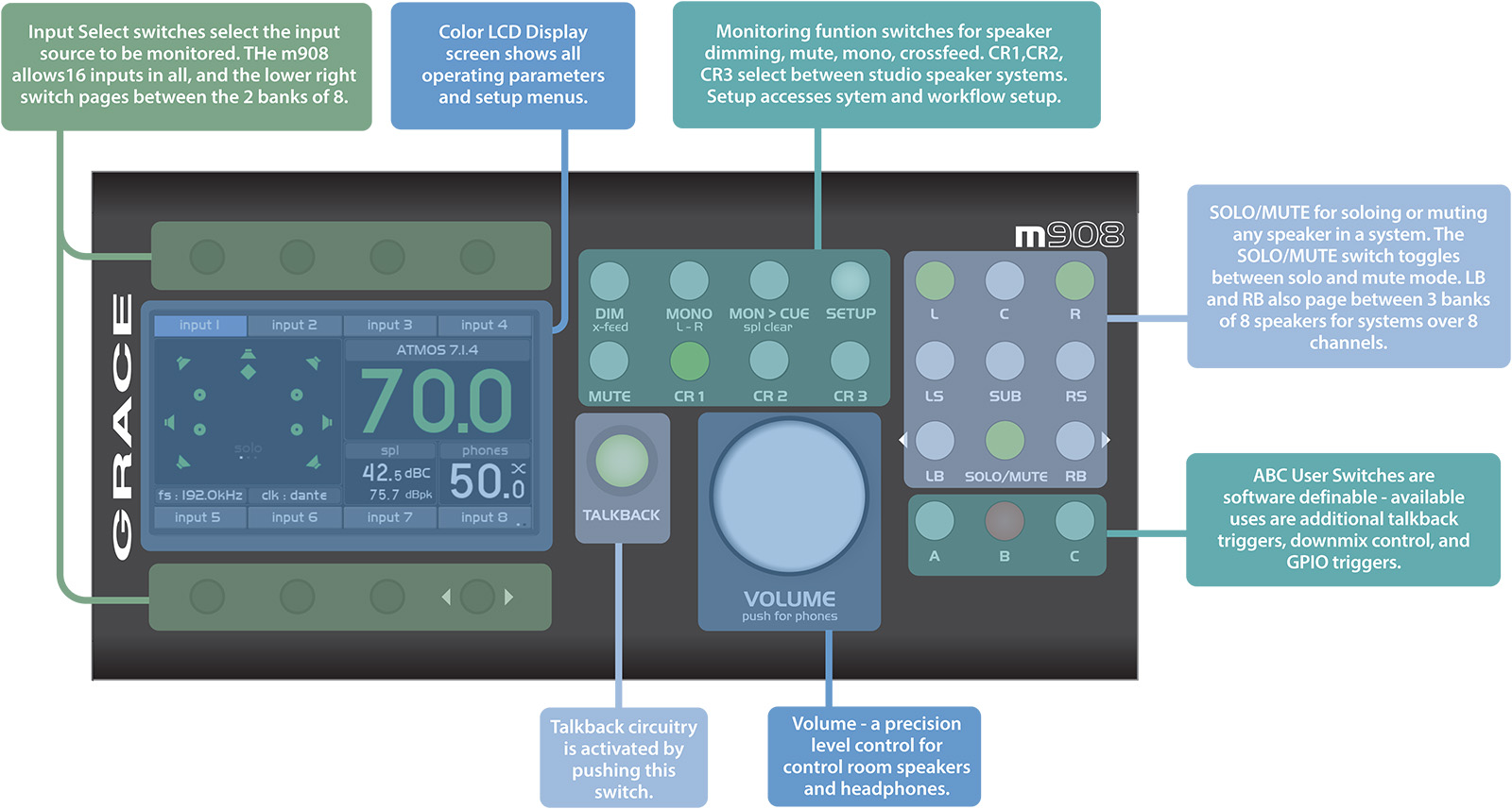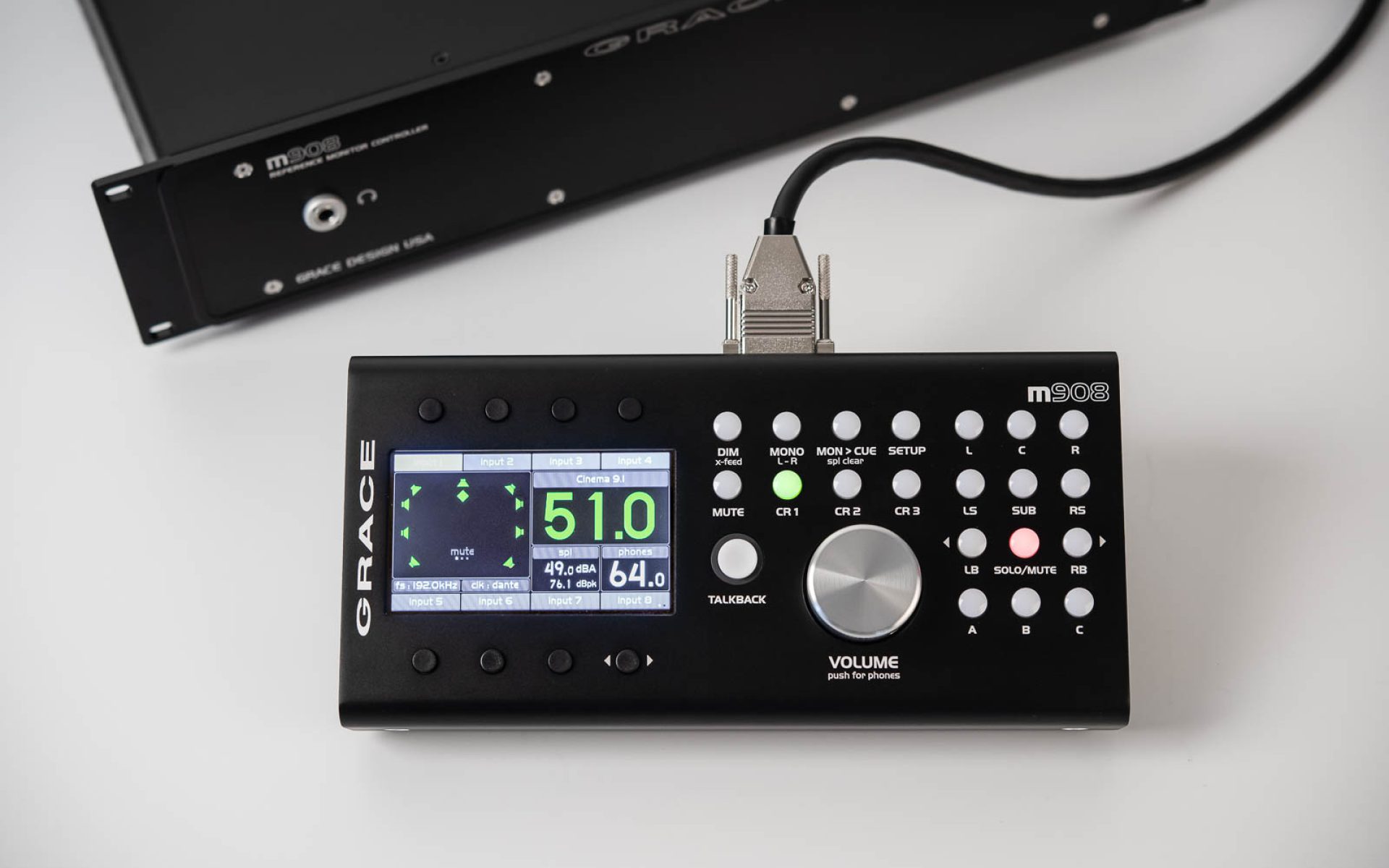 The m908 is a fully self contained plug and play monitor controller, with a full complement of monitoring features including cue channels, built in talkback mic, mono, mute and dim controls, and an exhaustive list of functions relating to surround and immersive playback systems. It is designed to enable professionals and facilities to update their workflows for immersive audio playback with a minimum of effort and cost.