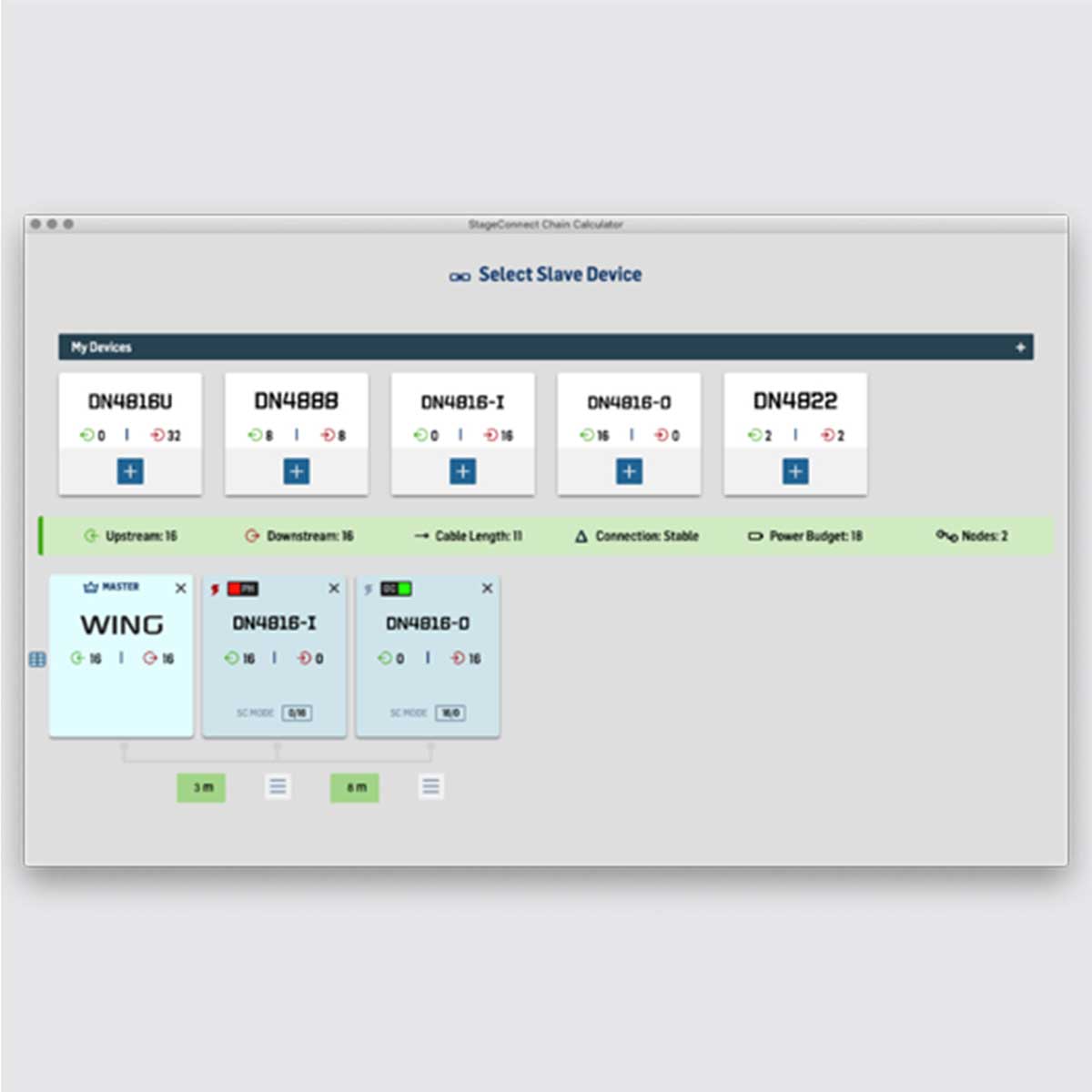 The StageConnect Calculator (SCC Tool) is a tool that can be used for checking and planning setups. You can create a virtual SC chain to study the upstream and downstream routing. The calculator also indicates parameters maximum DMX cable lengths, power budget and the overall stability of your connection.