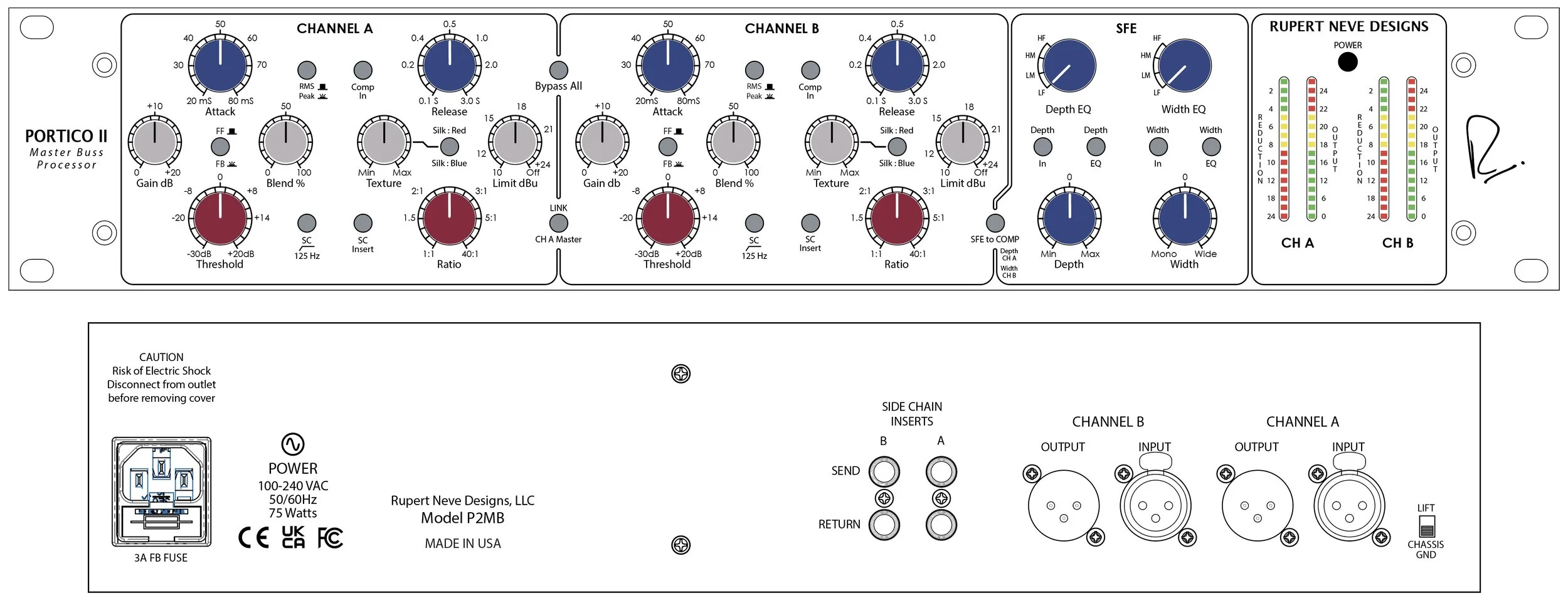 This illuminated push-button switch routes the Depth and Width information to Channel A and Channel B compressor paths, respectively, allowing the user to manipulate the dynamic content of the Mid and Side information. When engaged, the width and depth controls allow the user to blend the amount of compressed Mid and Side information that is mixed back into the audio path. While SFE to Comp is engaged, the stereo compressor is only available for SFE dynamic processing and is not operational within the main audio path.