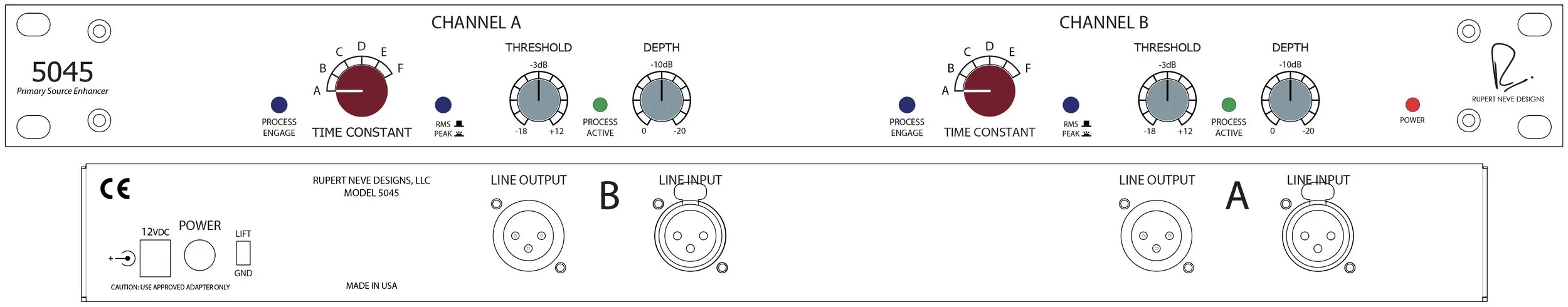 This LED indicates when the 5045 is actively affecting signal – a.k.a. when the input signal has overcome the enhancement threshold. Since this LED should generally be illuminated when the desired source is present (a vocalist singing, for example) it is extremely helpful in setting up the 5045 for use.