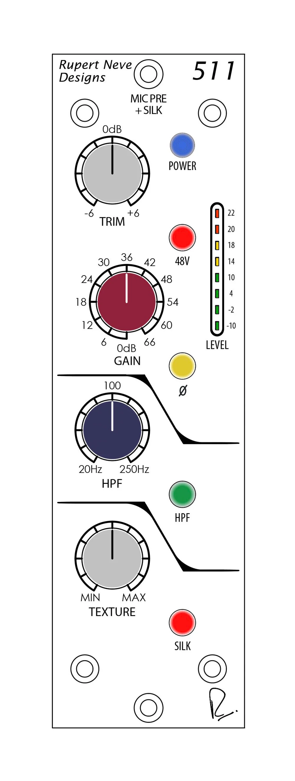 One of the key features of the 511 is the Silk / Texture control. The Silk circuit was initially developed for the original Portico series mic preamplifiers, and was only a single switch – on or off – that added a specified amount of musical, pleasing harmonic saturation to the unit’s output stage.