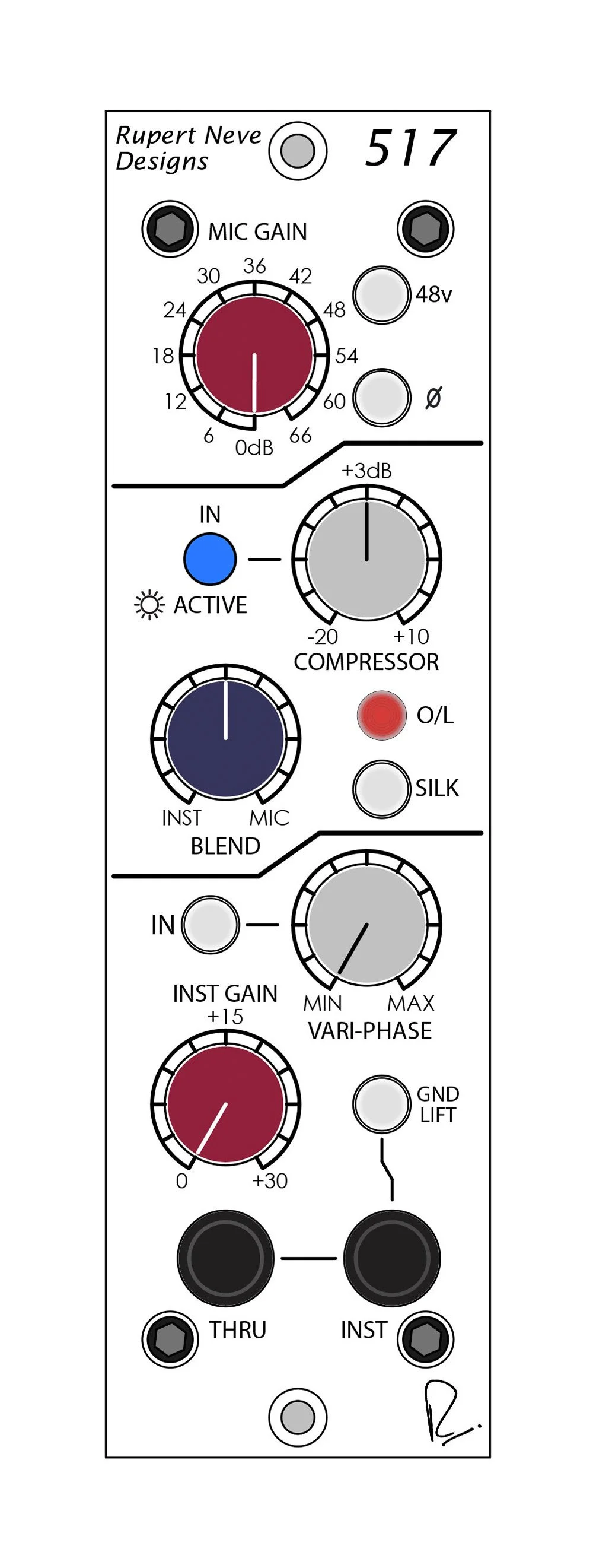 The 517 can be used to combine and compress the Mic input and the Instrument input. For example, the Instrument input could be used for an acoustic guitar’s pickup output while the Mic input is being used for either a guitar amp speaker or a vocal. The blend knob can then control the tonal balance between the two sources.