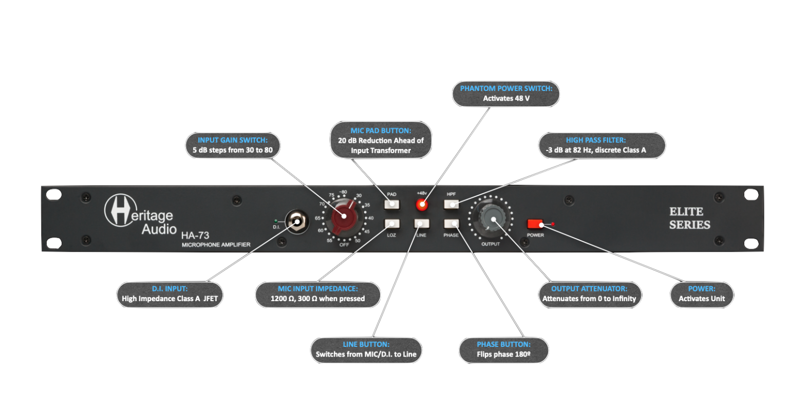 The HA-73 Elite features gain, output trim, -20 dB pad, polarity reverse, a high pass filter, and +48 V phantom power. It comes housed in a rugged 1RU British steel chassis and utilizes an external power supply for low noise operation.