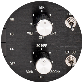 Use the mix knob to easily achieve analog parallel compression by dialing the dry signal alongside the compressed (wet) tone. The SC HPF knob engages a variable sidechain high pass filter with a range of 30-300Hz.