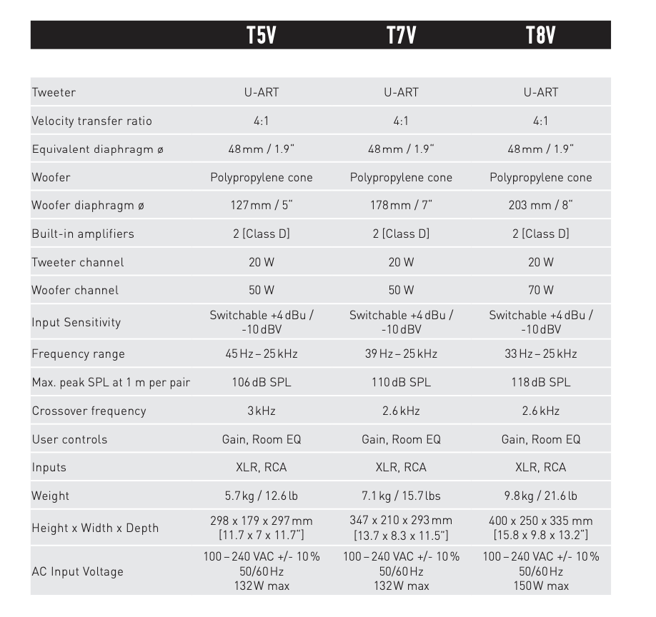 T7V 是一款雙向錄音室監聽音箱,專為近場應用中的垂直安裝而設計。