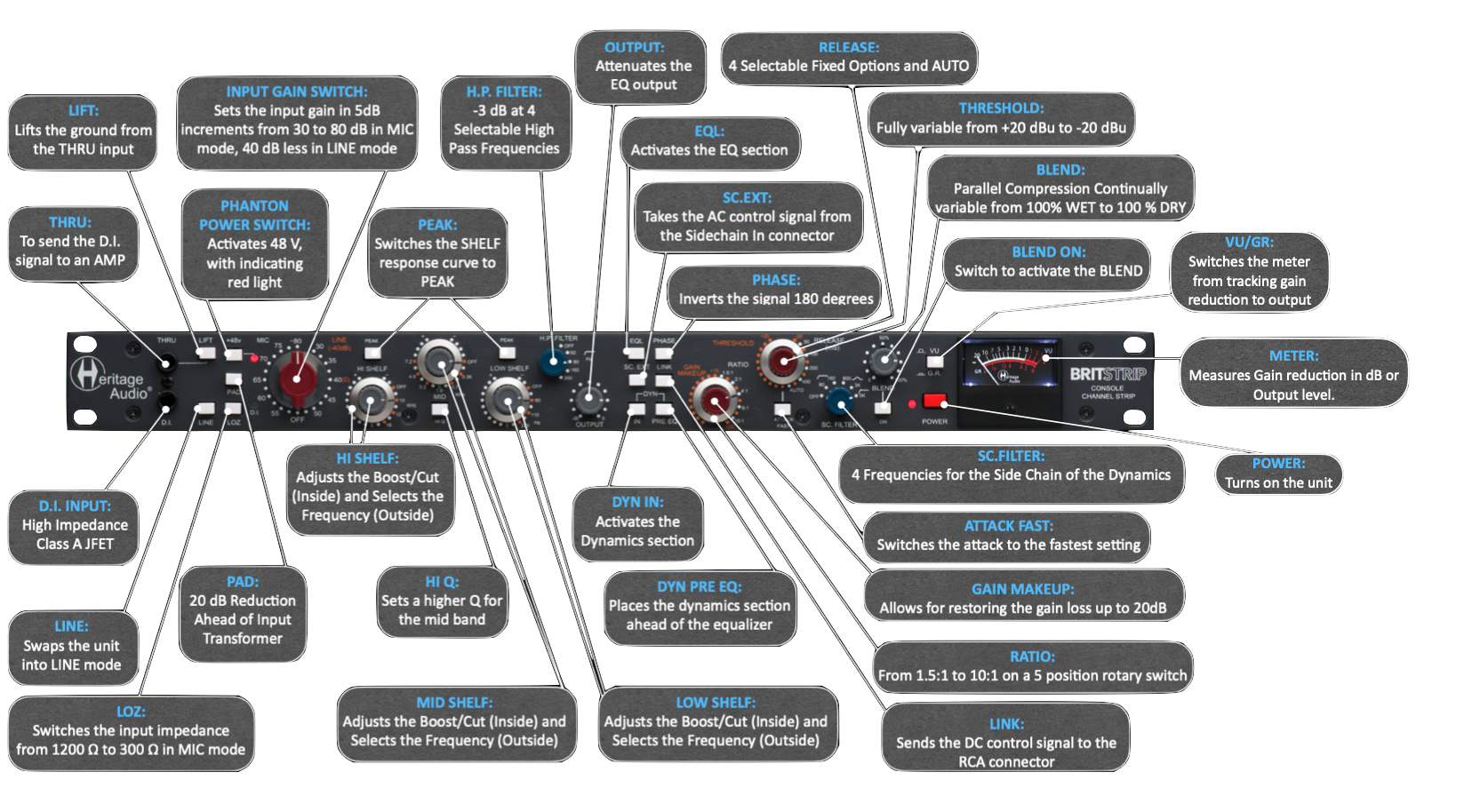 The BritStrip combines a real-deal 73 mic preamplifier, an expanded 73 style equalizer, a discrete Class A DI, and the infamous diode bridge compressor from Heritage Audio´s popular Successor. The closest equivalent of the BritStrip would be chaining together a 73 JR II, a 73 EQ JR and mono Successor — a $3,000 value pack in itself, but with added features and routing flexibility.