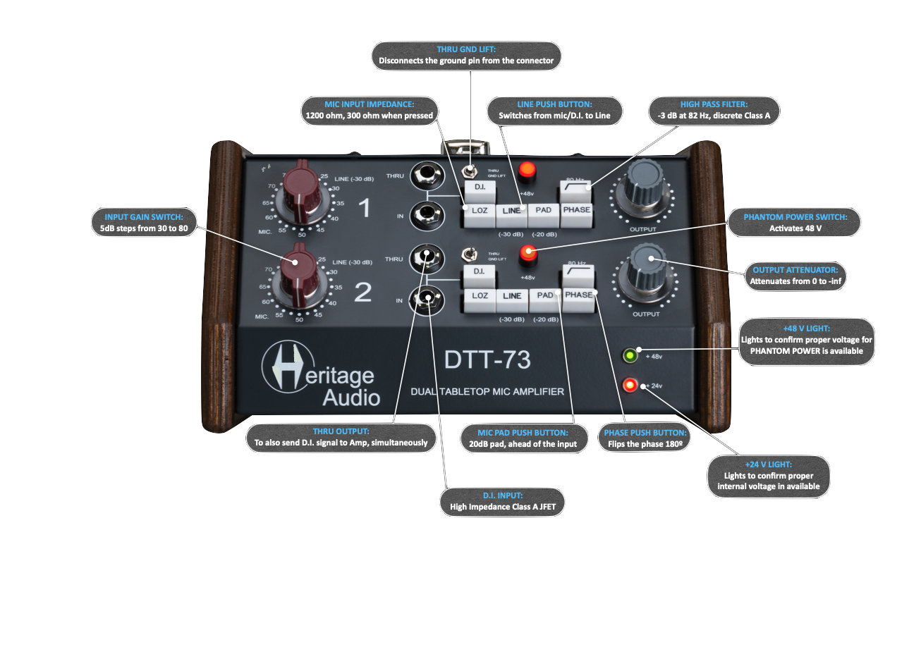 2-Channel Portable Mic/Line Class A Preamp, standing for DUAL TABLETOP 73, it is in essence a reformatted DMA 73. The DTT-73 widens the range of application to onstage use, portable systems, hotel rooms, on location recordings, etc.