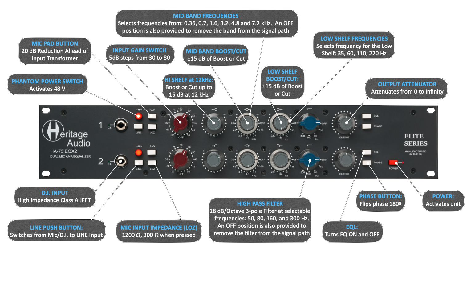 The HA-73 EQX2 Elite is made to the same specifications as the acclaimed 73 JR II, 73 EQ JR and DMA 73 Heritage Audio models at a price never heard before.