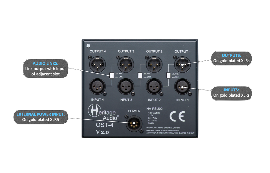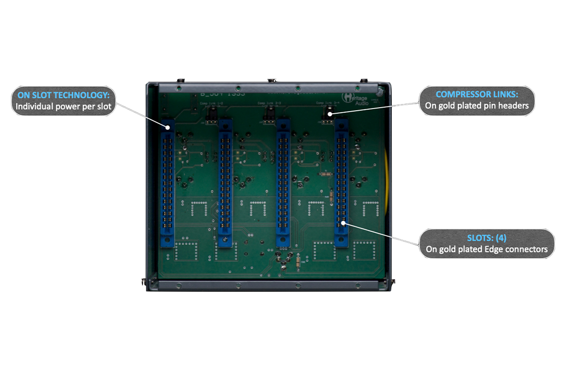 The OST-4 V2.0 enclosure features Heritage Audio’s On Slot Technology, providing maximum protection, filtering, and isolation to each channel. While most 500-series enclosures on the market have a relatively simple power supply design essentially feeding every channel in parallel, each channel of the OST-4 V2.0 enclosure has its own power supply, individually regulated and isolated from the rest. This ensures that every 500-series module installed will perform at its peak potential, and that no ‘power hungry’ or even a faulty module will compromise the performance of another. In addition to reducing interference, many 500-series devices actually exhibit lower self-noise and better performance when racked in the OST-4 V2.0 enclosure, especially mic preamps.