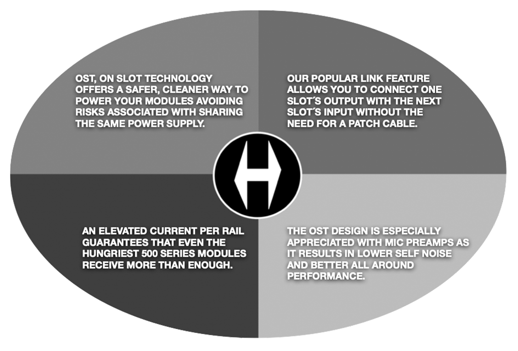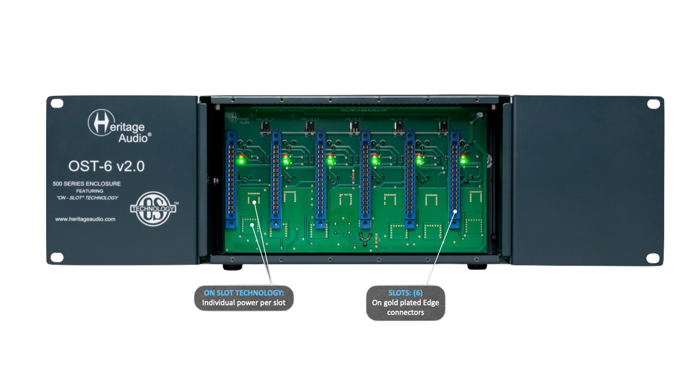The OST-6 V2.0 enclosure features Heritage Audio’s On Slot Technology, providing maximum protection, filtering, and isolation to each channel. While most 500-series enclosures on the market have a relatively simple power supply design essentially feeding every channel in parallel, each channel of the OST-6 V2.0 enclosure has its own power supply, individually regulated and isolated from the rest. This ensures that every 500-series module installed will perform at its peak potential, and that no ‘power hungry’ or even a faulty module will compromise the performance of another. In addition to reducing interference, many 500-series devices actually exhibit lower self-noise and better performance when racked in the OST-6 V2.0 enclosure, especially mic preamps.