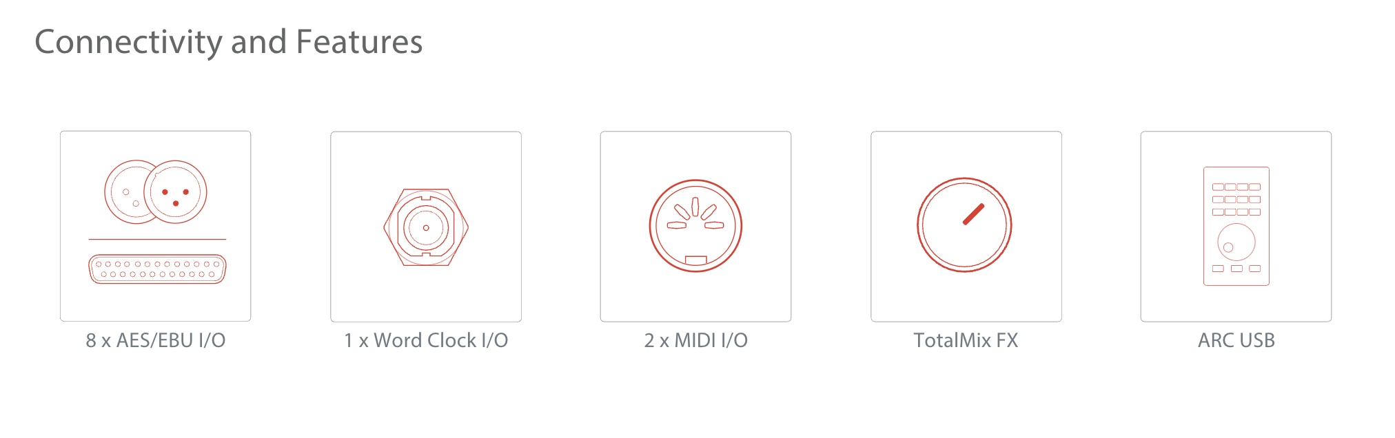 The HDSPe AES is a short-length PCI Express card with AES/EBU interfaces. It provides eight AES inputs (16 channels) and eight AES outputs (16 channels) at 192 kHz sample rate. The card is also equipped with two MIDI I/O ports, word clock I/O.