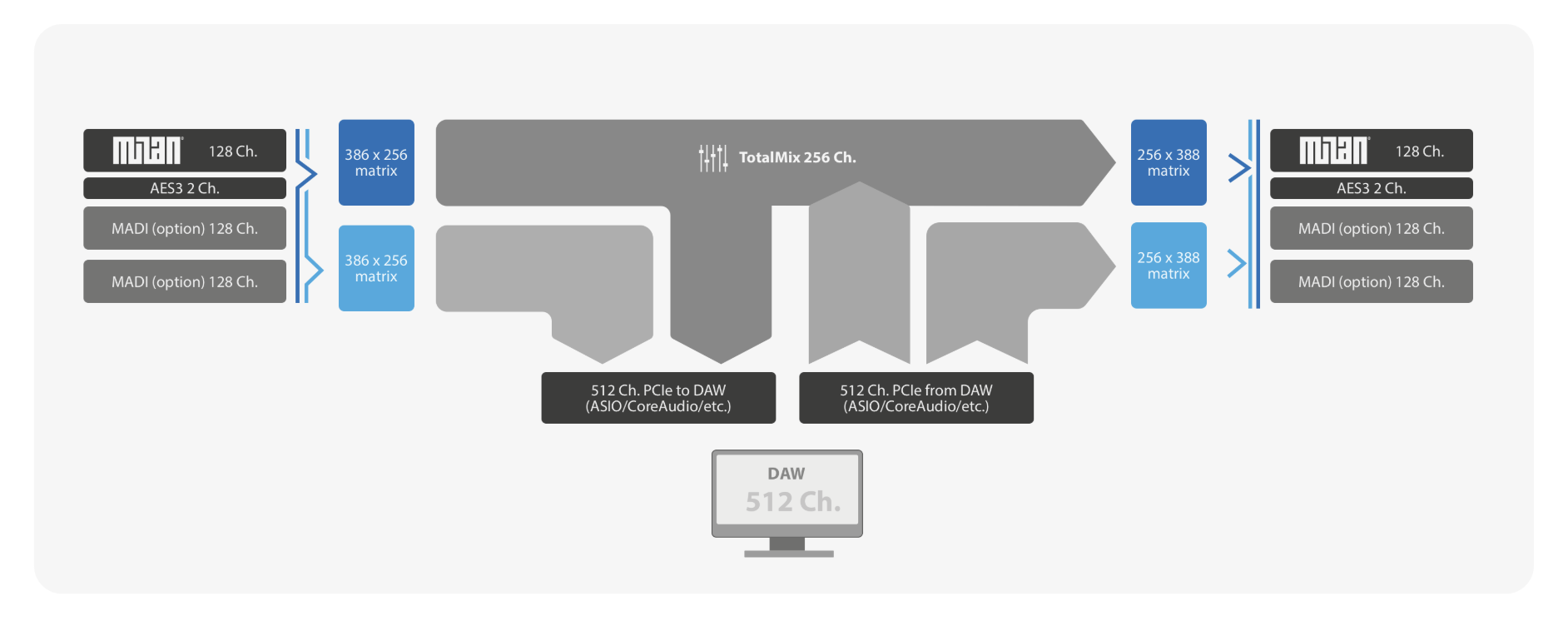 The vast number of channels can be managed by the user in two steps. Using a driver dialog or web interface, the user first adjusts the network vs. optional MADI channel count, and then pre-selects which inputs reach the 256 channel TotalMix engine. The remaining 256 channels are passed straight through. All 512 channels are visible to the DAW for recording. TotalMix offers its basic functionality without effects, but with all the great benefits such as presets, layouts, loopback, sub-mixes, and many more.