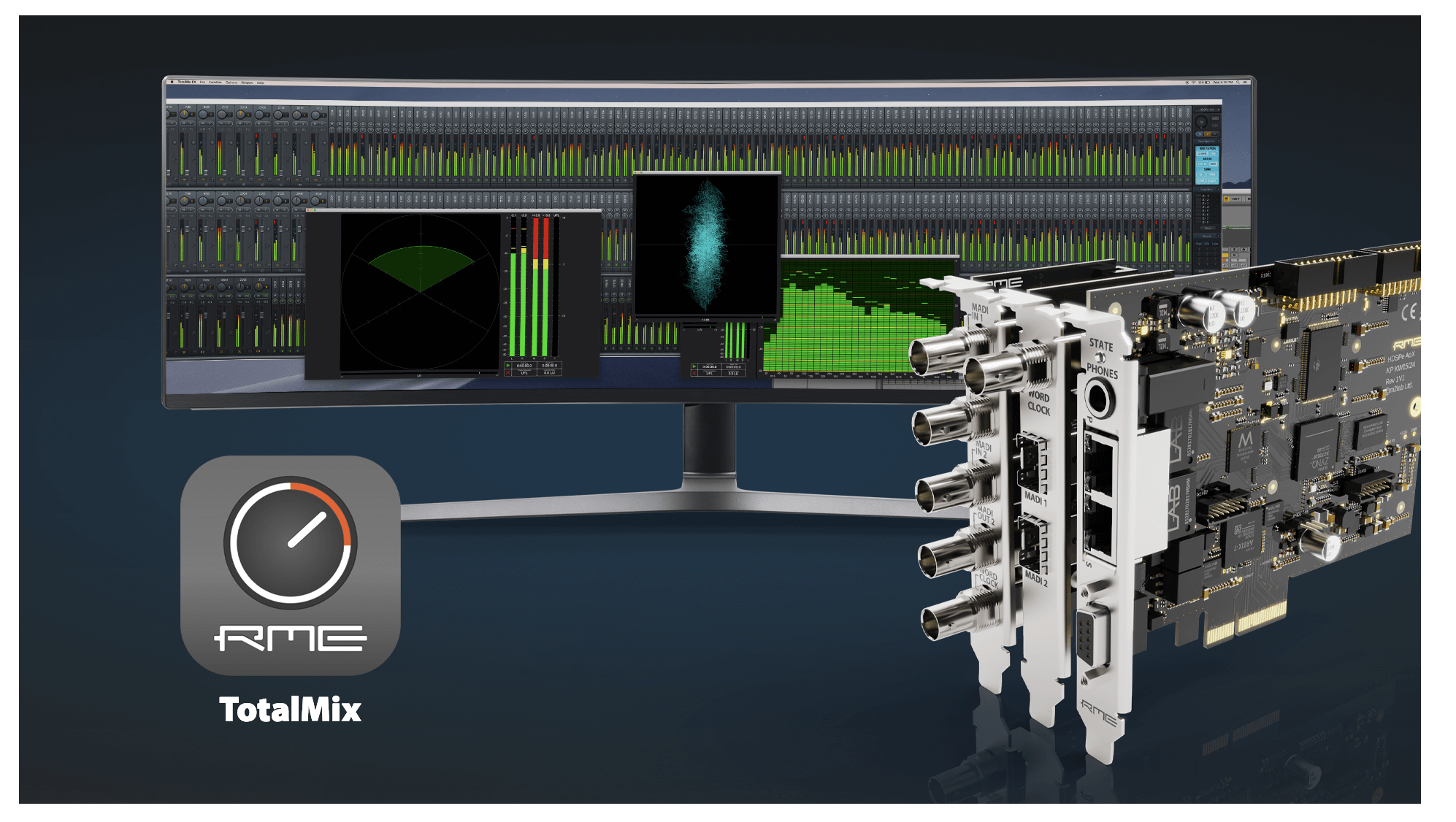The HDSPe AoX PCIe x4 audio interface cards combine dual network ports with headphone output, AES3, MIDI, and internal expansion headers for up to four MADI ports.